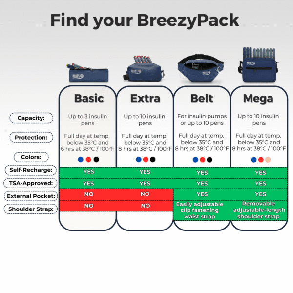 Our BreezyPacks are suitable for carrying insulin pens, vials, EpiPens® and any IN-USE medicine that needs to stay at room temperature at all times or after the first use.